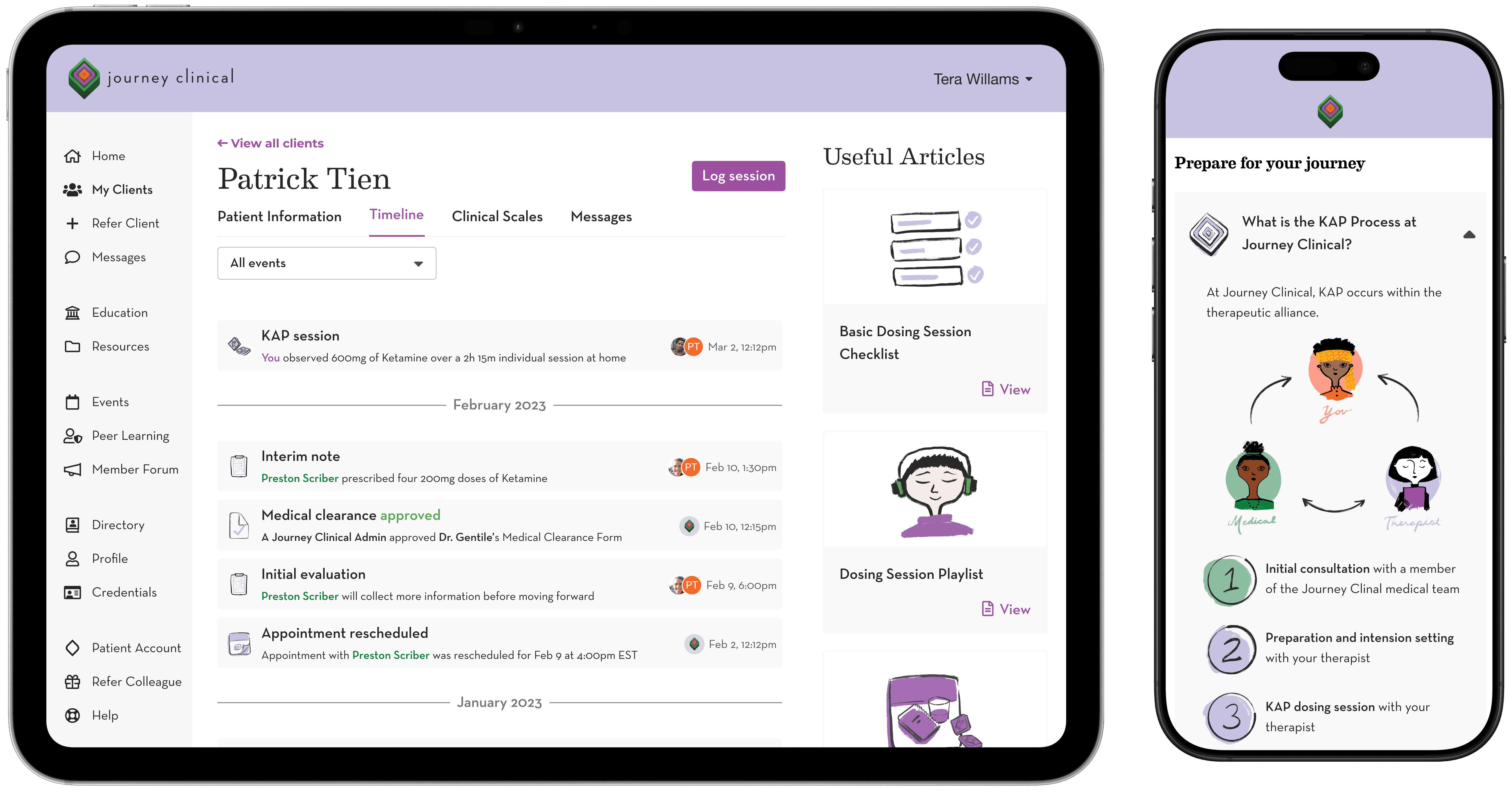 When I joined Journey Clinical they had a proof of concept and market fit. With thirty therapists on board and two part time doctors serving around 100 patients. They had a brand identity, one engineer, and fragments of a digital platform complemented by tens of google sheets, forms, pdfs, and several third party services. My challenge as a designer and product strategist was to prioritize which pieces of the fragmented—though functional—product to improve or extend while staying nimble and responding to a dynamic regulatory space.